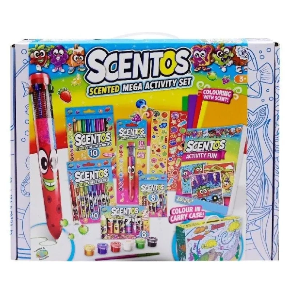 - zestaw zawiera: książeczkę aktywności (20 stron), zapachowe flamastry (10 szt.), zapachowe markery (10 szt), zapachowe kredki świecowe (8 szt.), zapachowe markery ze śmiesznymi minkami (8 szt.), zapachowy długopis żelowy (1 szt. multikolor), 1 arkusik naklejek, zapachowe farbki (6 szt.), pędzelek i 5 kolorowych kartek;