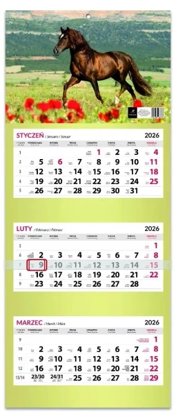 dostępny w 12 wzorach, 3 oddzielne miesięczne kalendaria, kaszerowana główka z uszlachetnionej lakierowanej tektury z dziurką do zawieszenia, ruchomy pasek PCV z okienkiem do zaznaczenia bieżącego dnia, uchwyty przytrzymujące kartki kalendarium, rozmiar 80x33,4cm