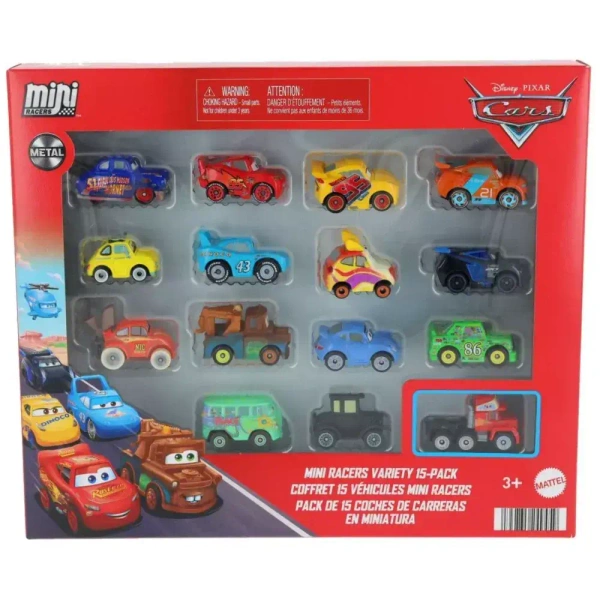 Ten zestaw 15 metalowych minisamochodzików wzorowanych na postaciach z serii „Auta” wytwórni Disney Pixar pozwala odtwarzać szalone przygody bohaterów. Każdy pojazd ma metalową karoserię, obrotowe koła i kultowe detale. Ten duży zestaw różnorodnych samochodów zabawek to gotowa minikolekcja. Mikroauta o wyglądzie wzorowanym na postaciach z filmu idealnie nadają się do zabawy w domu i poza nim. Mali posiadacze odjazdowej wyobraźni będą doskonale bawić się tą gotową kolekcją wyścigówek. Mogą dokładać do niej kolejne autka i zestawy, aby bez końca cieszyć się wspaniałym światem Aut Disney Pixar.