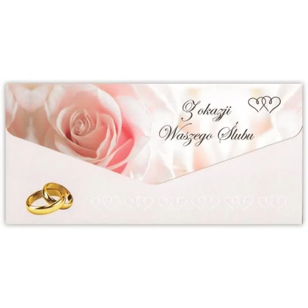 Po złożeniu format kartki DL, wyjątkowe złocenia, w środku życzenia i kieszonka na pieniądze. Dodatkowa koperta