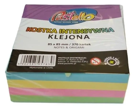 Kostka klejona kolorowa PASTELOWA, wymiar 85x85 370 kartek. Wykorzystywana do notatek i zapisków. Również do origami. Może służyć jako samodzielny bloczek lub wkład do pojemnika. Doskonały do biura, szkoły lub domu.