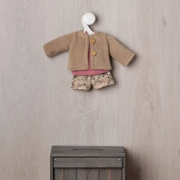 Stylowy komplet ubranek został zaprojektowany i ręcznie uszyty w Hiszpanii specjalnie dla lalek "przyjaciółek" z serii Sabrina. Różowa dzianinowa bluzeczka doskonale przentuje sie w komplecie z ciepłym płaszczykiem z ozdobnymi guziczkami z napisem: "handmade with love". W zestawie także krótkie spodenki w finezyjny wzór roślinny.