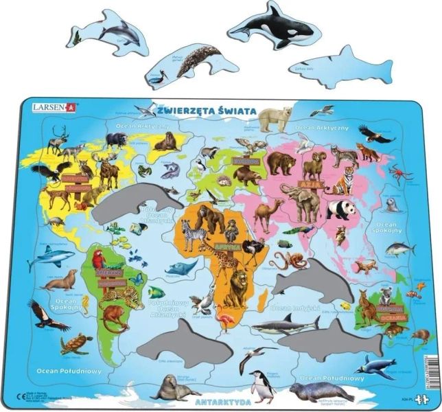 Poznaj tę wyjątkową układankę o tematyce przyrodniczej. Przedstawia ona kolorowe kontynenty oraz 75 różnych gatunków zwierząt. Unikalne kształty zachęcają dzieci do rozwijania wiedzy przyrodniczej oraz geograficznej. Wybrane gatunki zostały starannie rozmieszczone na ilustracji zgodnie z ich naturalnym środowiskiem, na przykład słoń znajduje się w Azji, a łoś w Ameryce Północnej. Układanka składa się z 28 starannie wyciętych elementów, dopasowanych do granic i linii brzegowych kontynentów, dzięki czemu jest idealna dla młodszych dzieci.