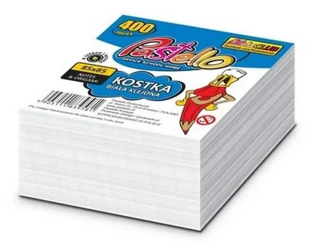 Kostka klejona biała, wymiar 85x85x35mm. Wykorzystywana do notatek i zapisków. Może służyć jako samodzielny bloczek lub wkład do pojemnika. Doskonały do biura, szkoły lub domu.