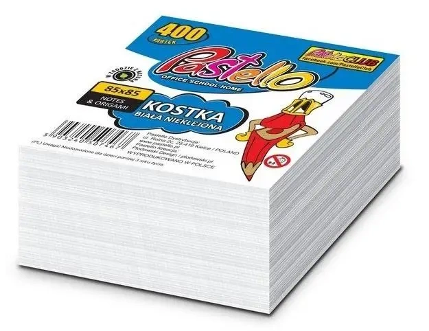 Kostka nieklejona biała, wymiar 85x85x35mm. Wykorzystywana do notatek i zapisków. Może służyć jako samodzielny bloczek lub wkład do pojemnika. Doskonały do biura, szkoły lub domu.