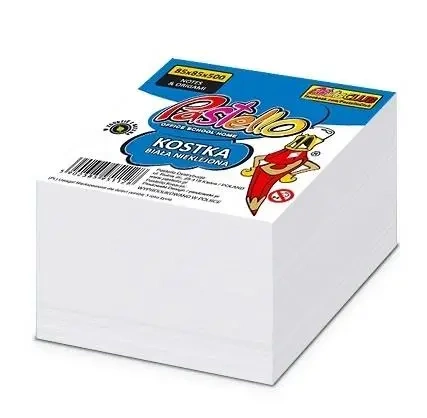 Kostka nieklejona biała, wymiar 85x85x50mm. Wykorzystywana do notatek i zapisków. Może służyć jako samodzielny bloczek lub wkład do pojemnika. Doskonały do biura, szkoły lub domu.