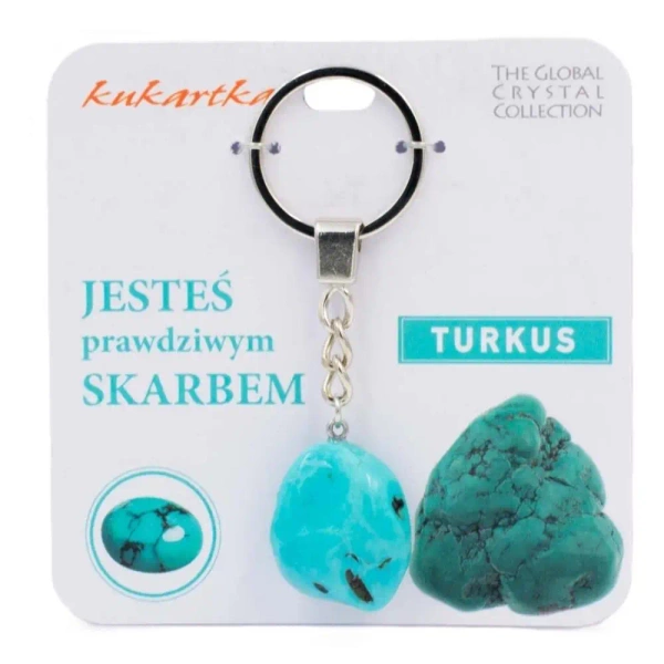 Brelok z kamieni naturalnych BKN-036 Jesteś skarbem Brelok dla kogoś wyjątkowego wykonany z naturalnego kamienia - turkusu, który chroni ciało, duszę i umysł. Turkus jest symbolem hojności, szczerości i oddania. Pomaga lepiej zrozumieć samego siebie i rozwinąć ukryte we wnętrzu talenty. Wymiary opakowania: 10 x 10 cm Długość breloka: 8 cm