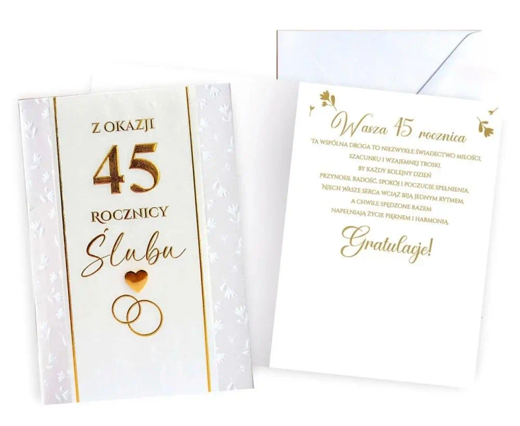 Kartka Dream Cards "Z okazji 45. rocznicy ślubu" DK-1342 Kartka B6 z ozdobnej serii Dream Cards - nieduża, ale robi wrażenie dzięki atrakcyjnej kolorystyce i ciekawym zdobieniom. To idealny wybór łączący przyjazną cenę z jakością. Cechy szczególne: wielkość: B6, 16.6 x 11.7 cm po złożeniu, koperta: w zestawie, kolorowa, zdobienia: kolorowe, różnorodne, bogate (w zależności od wzoru: przyklejane dekoracje, elementy biżuteryjne, odstawniki, metaliczne folie, tłoczenia itp.), okazja: Rocznica