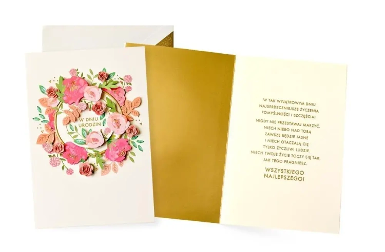 Karnet SCH-016 Urodziny Kartka B6 z ozdobnej serii Signature Cards - nieduża, ale robi wrażenie dzięki atrakcyjnej kolorystyce i ciekawym, przestrzennym zdobieniom. Cechy szczególne: wielkość: B6, 16.6 x 11.7 cm po złożeniu, koperta: dopasowana w zestawie, zdobiona metaliczną folią zdobienia: kolorowe, różnorodne, bogate (w zależności od wzoru: przyklejane przestrzenne dekoracje, metaliczne folie, tłoczenia itp.), okazja: urodziny