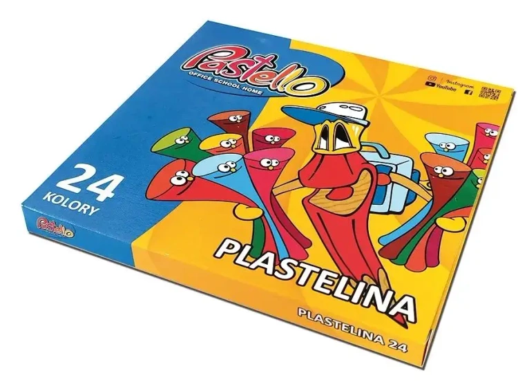 Plastelina 24 kolory. Przeznaczona do zabawy, nauki modelowania, tworzenia prac plastycznych, odciskania, wykrawania foremkami. Elastyczna, łatwa do modelowania, intensywne kolory. Nie brudzi rąk i nie przywiera do podłoża. Wyprodukowane w Polsce.