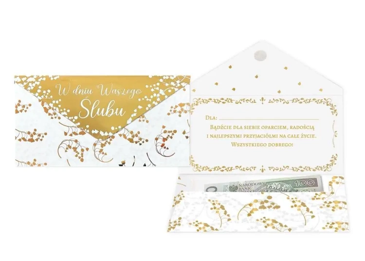Koperta podarunkowa na Ślub KOP-026 Koperta podarunkowa jest eleganckim sposobem na podarowanie bliskiej osobie banknotu lub karty podarunkowej. Koperta jest kolorowa i uszlachetniona metalizowaną folią hot-stamp, jest solidnie wykonana i wyposażona w rzep, co umożliwia jej wielokrotne otwieranie i zamykanie. Koperta zawiera życzenia w środku. Specyfikacja: wymiary: 20 x 10,5 cm (po złożeniu) wnętrze: życzenia w środku okazja: Ślub Koperty są pakowane po 3 szt.