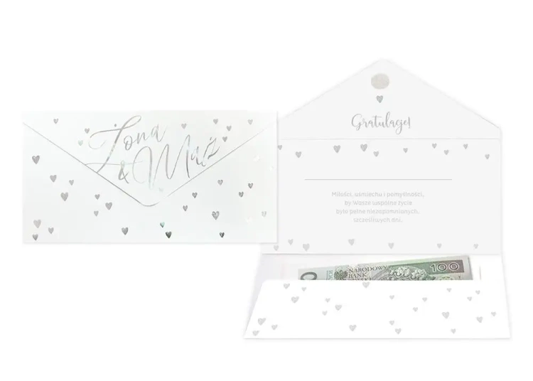 Koperta podarunkowa na Ślub KOP-028 Koperta podarunkowa jest eleganckim sposobem na podarowanie bliskiej osobie banknotu lub karty podarunkowej. Koperta jest kolorowa i uszlachetniona metalizowaną folią hot-stamp, jest solidnie wykonana i wyposażona w rzep, co umożliwia jej wielokrotne otwieranie i zamykanie. Koperta zawiera życzenia w środku. Specyfikacja: wymiary: 20 x 10,5 cm (po złożeniu) wnętrze: życzenia w środku okazja: Ślub