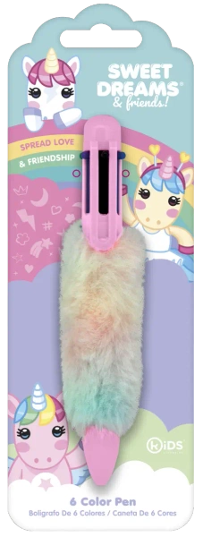 Puszysty długopis z motywem Jednorożca Sweet Dreams zawierający 6 różnych kolorów. Ten wielofunkcyjny długopis jest świetnym elementem wyposażenia piórnika na powrót do szkoły.