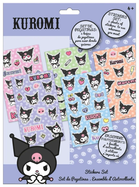 Zestaw z naklejkami z ulubionymi postaciami ze świata Kuromi. • Zestaw naklejek• Materiał: papier• Wymiary: 25x15x0,2 cm• Zawartość: 92 naklejki