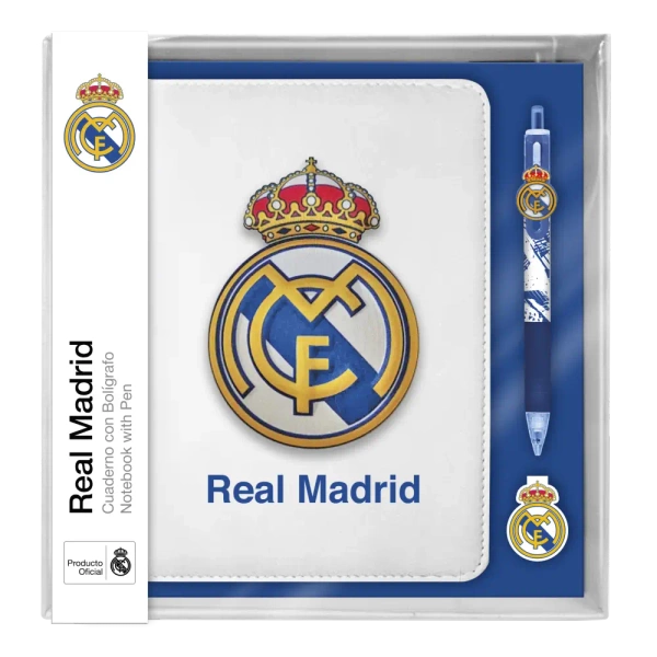 "Niezbędny zestaw dla prawdziwych fanów Realu Madryt. Zawiera notatnik A5 z kartkami w linie, idealny do notatek, pomysłów lub treningu mentalnego. Jego okładka wykonana jest z wyściełanej pianki EVA, z wypukłym herbem klubu, nadając mu odporne wykończenie i prezencję.Zestaw uzupełnia pasujący długopis i zakładka w kształcie herbu Realu Madryt, idealne do oznaczania stron z dumą klubu.Design, użyteczność i pasja do kolorów. Wszystko w jednym zestawie".
