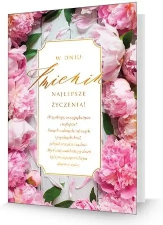 Kartka zawiera życzenia. W zestawie znajduje się koperta, kolorystycznie uzupełniająca się z kartką.