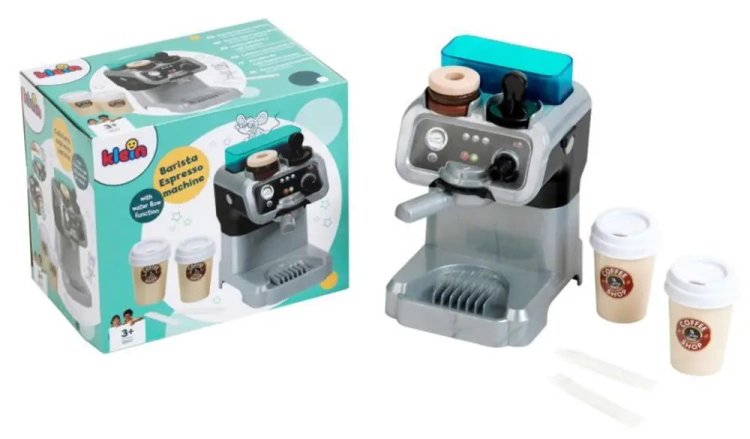 Klein 9510 Barista - Ekspres do kawy Stylowy ekspres do kawy jest wyposażony w liczne nowoczesne akcesoria: dwie filiżanki do kawy z pokrywkami na wynos, uchwyt filtra, trzy kapsułki z kawą, dwie saszetki z cukrem i ubijak do kawy. Zestaw Barista wyposażony jest w pojemnik na wodę i funkcję przepływu. Dzieci z przyjemnością częstują swoje lalki, pluszowe misie, a nawet mamę, tatę, babcię i dziadka espresso w swoich kuchniach do zabawy. Ten nowoczesny i przyjazny dzieciom ekspres do kawy idealnie się do tego nadaje: wystarczy napełnić zbiornik wodą, włożyć kapsułkę z kawą, docisnąć ją ubijakiem jak profesjonalny barista, a następnie nacisnąć przycisk włączania. Woda spływa do atrakcyjnej filiżanki niczym fantazyjna kawa i można ją podać. Zabawa dla wszystkich grup wiekowych! Specyfikacja: Wymiary: 12 cm x 17 cm x 18,5 cm Odpowiedni dla dzieci w wieku 3 lat i starszych