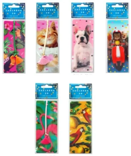 Kolorowe, trójwymiarowe zakładki do książek z ozdobnym, kolorowym chwostem, zapakowane w folię