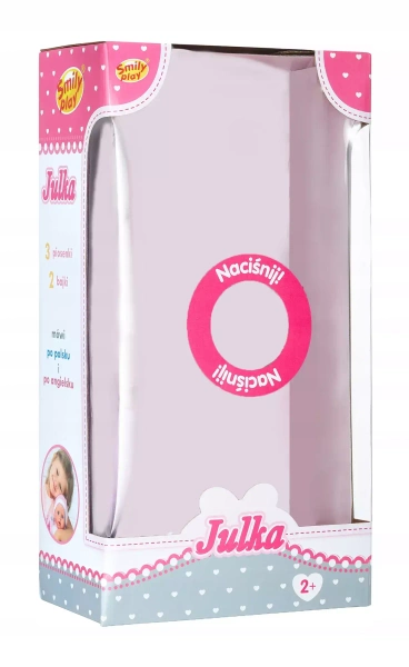 LALKA JULKA UCZY,ŚPIEWA,OPOWIADA SMILY PLAY SP83871 Julka śpiewa 3 piosenki opowiada 2 bajki;"Czerwony Kapturek" i "Złotowłosa i 3 misie" mówi po polsku i angielsku ponad 60 polskich słów ponad 60 angielskich słów Lalka wygląda jak słodki, niebieskooki dzidziuś-dziewczynka. Ma gumową główkę, rączki i stopki, brzuszek zaś jest z materiału .(zgaduję) :) Ubrana w szarą, pluszową sukienkę z wyszytą mordką kotka, różowe spodenki-śpioszki i bluzeczkę w biało-różowe paski. Na głowie różowa czapka z uroczym kwiatem, dopełnia całości. Sympatyczny bobasek, który sprawi wiele radości małej opiekunce, stanie się ulubionym towarzyszem wspólnych zabaw. Nową przyjaciółkę może wozić w wózku oraz usypiać w łóżeczku lub kołysce(nie dołączono) Lalka wykonana z dobrej jakości materiałów,starannie i precyzyjnie. Zabawka rozwija zmysł opiekuńczy Umiejętność kreatywnej zabawy małą motorykę wspiera naukę angielskiego wspiera naukę poprawnej wymowy SPECYFIKACJA Kod produktu: SP83871 Wymiary lalki: wys: 32,5 x 17 x 9,5 cm Baterie : 3x AG13 1,5V (dołączono) Zabawka przeznaczona dla dzieci od 2 lat Marka:Smily Play
