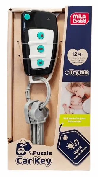 Zabawka w formie kluczyków samochodowych z efektami świetlnymi i dźwiękowymi, zapakowana w kartonowe pudełko. Podane wymiary są wymiarami opakowania. Zabawka działa na baterie typu AG13. Baterie znajdują się w zabawce. Zabawka przeznaczona dla dzieci od 12 miesiąca życia.