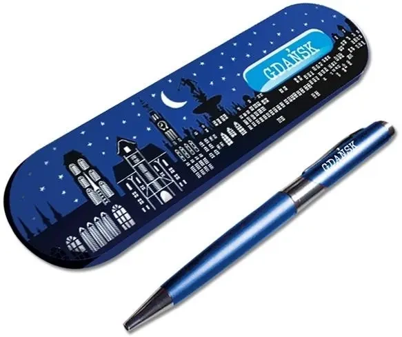 Pamiątkowy długopis z etui ozdobiony motywami związanymi z polskimi miastami.
