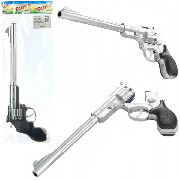 Rewolwer "AF-1B" z Długą Lufą - Realistyczna Zabawka Westernowa/Policyjna (Srebrny/Czarny) na kapiszony Wkrocz do świata dzikiego zachodu lub ekscytujących policyjnych pościgów z naszym realistycznym rewolwerem "AF-1B" o imponująco długiej lufie! Ta starannie wykonana zabawka to idealna propozycja dla dzieci, które uwielbiają odgrywać role i tworzyć własne, pełne akcji scenariusze. Dostępny w klasycznym srebrnym kolorze z czarną rękojeścią, z pewnością wyróżni się w każdej kolekcji zabawek. Realistyczny Design i Imponujące Wymiary: Rewolwer został zaprojektowany z dbałością o szczegóły, wiernie odwzorowując wygląd prawdziwej broni z długą lufą, co nadaje mu charakterystyczny wygląd rewolweru snajperskiego lub westernowego. Wykonany z solidnego tworzywa sztucznego, imitującego metal, zapewnia trwałość i odporność na intensywną zabawę. Antypoślizgowa, czarna rękojeść z fakturą zapewnia pewny chwyt, a widoczne elementy, takie jak bębenek i spust, dodają autentyczności. Na korpusie widnieje napis "AF-1B" oraz "Guangdong China". Bezpieczna Zabawa w Odgrywanie Ról: Ten zabawkowy rewolwer jest bezpieczny w użytkowaniu i przeznaczony do zabawy w odgrywanie ról. Nie strzela pociskami, co eliminuje ryzyko związane z niebezpiecznymi przedmiotami. Dzieci mogą bez obaw wcielać się w postacie szeryfów, kowbojów, agentów specjalnych czy policjantów, rozwijając swoją kreatywność i umiejętności społeczne poprzez interakcję z innymi. Rewolwer można załadować kapiszonami (brak w zestawie) Rozwój Wyobraźni i Ról: Zabawa rewolwerem to doskonały sposób na: Rozwijanie wyobraźni i kreatywności: Dzieci mogą tworzyć własne historie, scenariusze i dialogi. Wspieranie umiejętności społecznych: Idealna do zabawy z rówieśnikami w "policjantów i złodziei" czy "kowbojów". Rozwijanie zdolności narracyjnych: Układanie fabuły i odgrywanie różnych postaci. Idealny Prezent: Rewolwer "AF-1B" to świetny prezent dla każdego dziecka, które uwielbia zabawę w odgrywanie ról, przygody i akcję. Doskonały na urodziny, święta czy inną okazję. Specyfikacje (dla pojedynczego rewolweru): Wymiary: 40x14x9cm Materiał: Wysokiej jakości tworzywo sztuczne z imitacją metalicznego wykończenia. Kolory: Srebrny z czarną rękojeścią (jak na zdjęciu). Zawartość Zestawu: 1x Zabawkowy rewolwer. (Sprzedawane w opakowaniach blistrowych, jak na zdjęciu, więc można zakupić pojedynczą sztukę). Zalecany Wiek: Od 3 lat (jak sugeruje oznaczenie na opakowaniu).