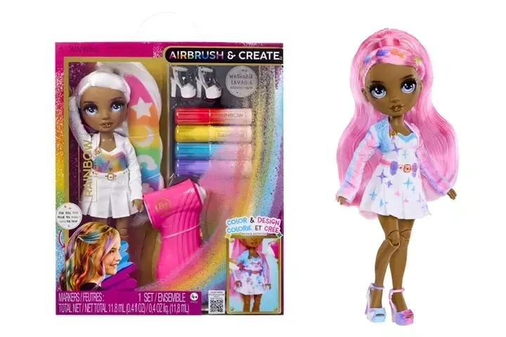 Lalka z szarymi oczami czeka na dodanie kolorów. Pokoloruj dołączonymi barwnikami i aerografem jej włosy i ubranie. Można także użyć akcesoriów na włosach dziecka.