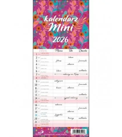 Kalendarz ma wymiary 14,00 x 34,00 cm. Podobny kalendarz dla rodzin możesz kupić również w formacie dużym oraz małym.