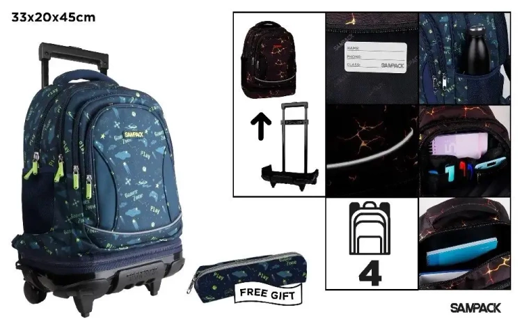 Plecak ze stelażem i kółkami granatowy play czterokomorowy 33x20x45cm, piórnik w zestawie