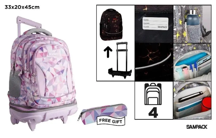 Plecak ze stelażem i kółkami lawendowy geometryczny czterokomorowy 33x20x45cm, piórnik w zestawie