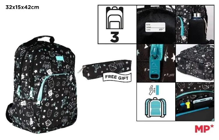 Plecak trzykomorowy czarny 32x12x38cm + piórnik - MP Main Paper
