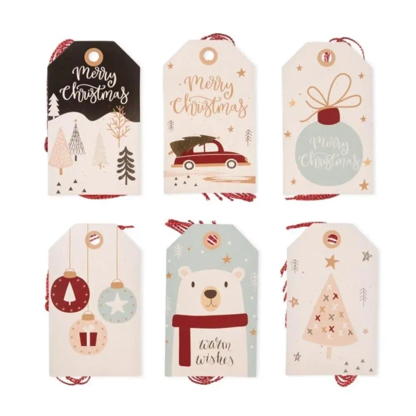 W kompletach tagów do prezentów znajduje się 6 różnorodnych wzorów ozdobionych świątecznymi motywami, które są utrzymane w delikatnych, pastelowych kolorach. Oryginalne i unikalne zawieszki mogą być także wykorzystane w twórczych projektach z zakresu scrapbookingu lub do ozdabiania świątecznych kartek.