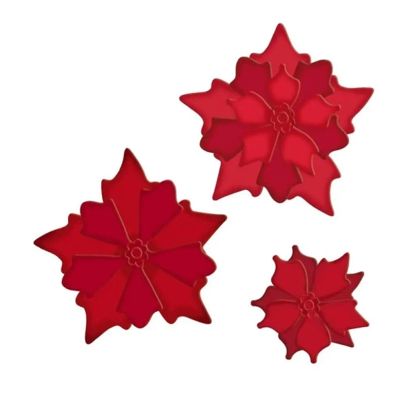 Zestaw 4 wykrojników w kształcie płatków poinsecji, znanej powszechnie jako gwiazda betlejemska. Dzięki różnym rozmiarom i kształtom płatkom można je doskonale dopasowywać do swoich twórczych potrzeb oraz układać warstwowo by uzyskać modny i stylowy efekt 3D! Dodatkowo, łącząc ze sobą różne wykrojniki z zestawu można uzyskać inne formy kwiatów.