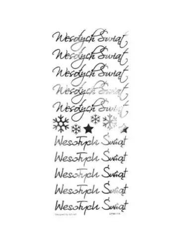Zestaw zawiera 16 naklejek srebrnych, ażurowych, na których widnieje napis: "Wesołych Świąt". Prezentowane naklejki występują w dwóch stylach pisowni, co dodaje im elegancji. Są też dekorowane gwiazdami i śnieżynkami w różnych rozmiarach.