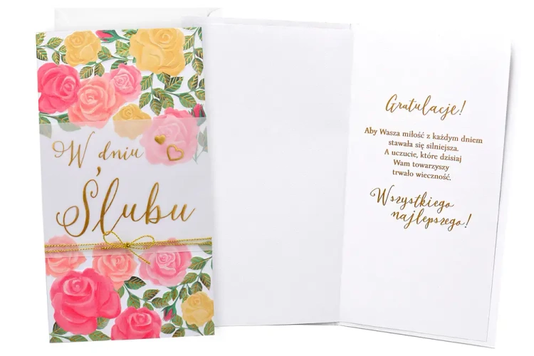 Kartka ślubna wykonana jest z trwałych materiałów.
