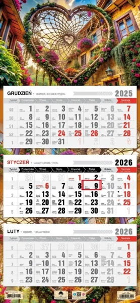 Kalendarz 2026 TRÓJDZIELNY PŁASKA GŁÓWKA. Format 315/680mm. Trzy komplety klasycznych kalendariów z przesuwnym okienkiem. Główka wypukła z otworem wierconym. Dodatkowo nazwy miesiąca i dni tygodnia w języku Ukraińskim, Angielskim i Niemieckim. Kalendarium dodatkowo zawiera fazy księżyca i znaki zodiaku. Dużo miejsca do notowania, czytelne duże litery i cyfry. Nowoczesne i klasyczne wzornictwo, dopracowane wzory, czytelne kalendarium. Praktyczny i elegancki kalendarz który sprawdzi się zarówno w domu, biurze jak i innych pomieszczeniach.