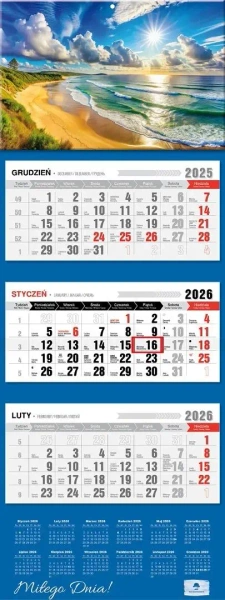 Kalendarz 2026 Trójdzielny PREMIUM Z WYPUKŁĄ GŁÓWKĄ. Format 315/810mm. Trzy komplety klasycznych kalendariów z przesuwnym okienkiem. Główka wypukła z otworem wierconym. Dodatkowo nazwy miesiąca i dni tygodnia w języku Ukraińskim, Angielskim i Niemieckim. Kalendarium dodatkowo zawiera fazy księżyca i znaki zodiaku. Dużo miejsca do notowania, czytelne duże litery i cyfry. DODATKOWO PRZEDŁUŻONE PLECKI KOLOREM DOPASOWANE DO WZORU ZE SKRÓCONYM KALENDARIUM NA ROK 2026. Nowoczesne i klasyczne wzornictwo, dopracowane wzory, czytelne kalendarium. Praktyczny i elegancki kalendarz który sprawdzi się zarówno w domu, biurze jak i innych pomieszczeniach.