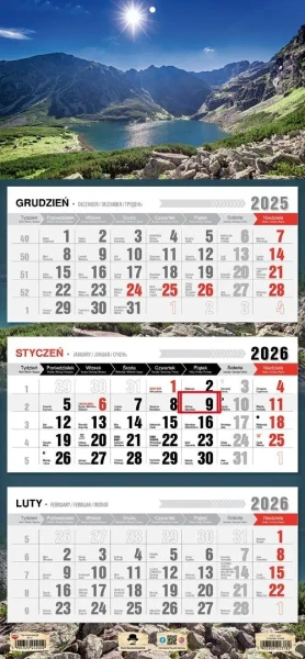 Kalendarz 2026 TRÓJDZIELNY PŁASKA GŁÓWKA. Format 315/680mm. Trzy komplety klasycznych kalendariów z przesuwnym okienkiem. Główka wypukła z otworem wierconym. Dodatkowo nazwy miesiąca i dni tygodnia w języku Ukraińskim, Angielskim i Niemieckim. Kalendarium dodatkowo zawiera fazy księżyca i znaki zodiaku. Dużo miejsca do notowania, czytelne duże litery i cyfry. Nowoczesne i klasyczne wzornictwo, dopracowane wzory, czytelne kalendarium. Praktyczny i elegancki kalendarz który sprawdzi się zarówno w domu, biurze jak i innych pomieszczeniach.
