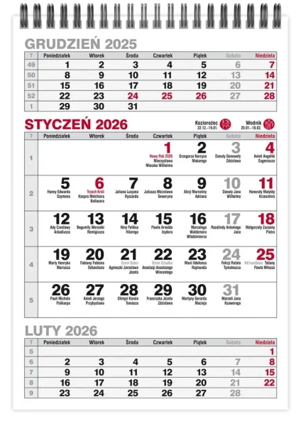 Kalendarz 2026 Biurkowy A5 TRÓJDZIELNY PIONOWY NA SPIRALI. Oprawa czarna spirala na sztywnej podstawie kartonowej. Format 145/210mm. Papier offsetowy, okładka papier kredowy. 26 strony (dwa układ miesięczne ) + okładka. Układ kalendarium w stylu kalendarza trójdzielnego ( z drugiej strony miejsce na notatki na każdy dzień). Kalendarz zawiera imieniny, nazwy świąt, numeracje tygodni, znaki zodiaku. Kalendaria PL EN DE UE.