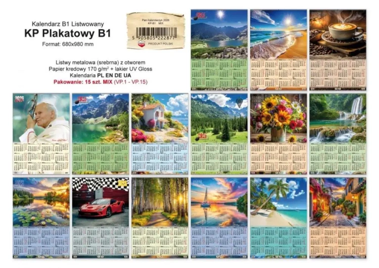 Kalendarz 2026 PLAKATOWY LAKIEROWANY B1 LISTWOWANY MIX WZORÓW 15szt widocznych na zdjęciu.