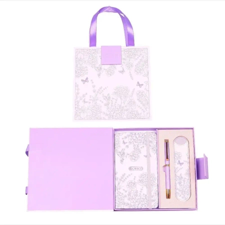 Zestaw prezentowy w ciekawym opakowaniu imitującym torebkę prezentową. Komplet zawiera notes z gumką i wstążką, długopis oraz etui skóropodobne na długopis. Zestaw upominkowy spakowany w kartonowe etui z zapięciem magnetycznym. Po zamknięciu opakowanie przybiera postać torebki prezentowej z uchwytami ze wstążki. Zatem po zakupie jest to gotowy prezent do wręczenia na różne okazje. Kolorystyka fioletowa.