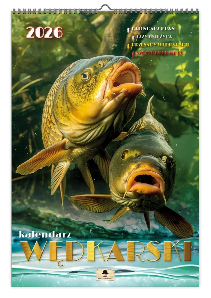 Kalendarz 2026 ścienny A3 drukowany jednostronnie 12 kart + 2 okładki. Format 320/470mm. Papier kredowy, oprawa spirala z zawieszką, Duże czytelne kalendarium z miejscem na notatki, duża czytelna czcionka. Dodatkowo nazwy miesiąca i dni tygodnia w języku Ukraińskim, Angielskim i Niemieckim. Zawiera imieniny, nazwy świąt, czas wschodu i zachodu Słońca, fazy Księżyca oraz znaki Zodiaku. DODATKOWO KALENDARZ ZAWIERA PORADY ,DOWCIPY I PRZYSŁOWIA WĘDKARSKIE, KALENDARZ BRAŃ, NAZWY I OPISY GATUNKÓW RYB POD KAŻDYM ZDJĘCIEM.