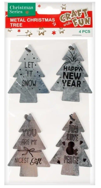 Opakowanie zawiera 4 zawieszki metalowe w kształcie choinki. Przy pomocy tego zestawu możesz zaprojektować własne ozdoby świąteczne. Elementy zestawu można łączyć z innymi akcesoriami dekoracyjnymi Craft With Fun.