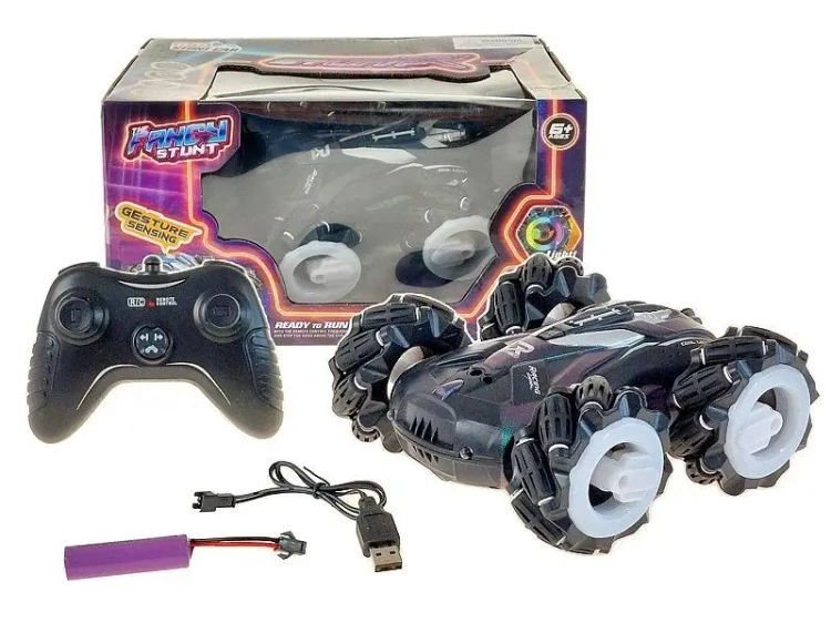 auto kaskaderskie na radio, 16,5x15,7x8,5cm, driftujące, światło i muzyka, kabel USB i akumulator; 27x20,5x14cm, W/B