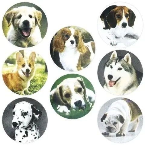 Naklejki papierowe na taśmie 8 wzorów psy O25mm 500szt.
