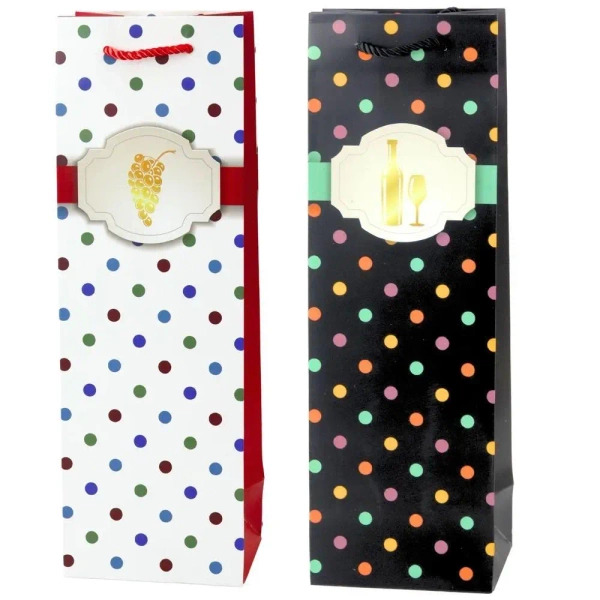 Elegancka torebka prezentowa na wino to idealne rozwiązanie, aby w wyjątkowy sposób zapakować butelkę alkoholu lub inny upominek o podobnym kształcie. Klasyczny design w kolorowe kropki, uzupełniony złotym motywem butelki i kieliszka, nadaje jej wyrafinowanego charakteru, który doskonale sprawdzi się przy każdej okazji - od urodzin, przez rocznice, po święta.