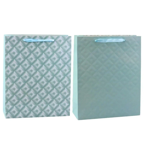 Torba została wykonana z wysokiej jakości, usztywnionego papieru, a jej powierzchnia zdobiona jest tłoczonym geometrycznym wzorem, który pięknie odbija światło. Dwa warianty przodu i tyłu sprawiają, że torba prezentuje się wyjątkowo stylowo z każdej strony. Satynowe uchwyty w jasnym odcieniu nadają całości subtelnego charakteru i zapewniają komfort przenoszenia.