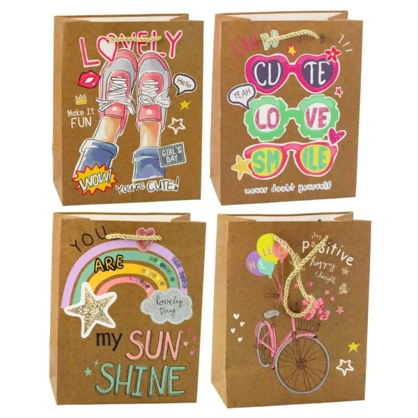 Torba wyróżnia się czterema różnorodnymi motywami. Każdy z motywów zachwyca żywą kolorystyką oraz pozytywnymi hasłami, które podkreślają młodzieżowy i optymistyczny charakter. Mocne sznurkowe uchwyty zapewniają wygodne przenoszenie i są dopasowane kolorystycznie do motywu. Torba o wymiarach 23 x 18 x 10,5 cm świetnie nadaje się do pakowania średnich i mniejszych prezentów, takich jak kosmetyki, akcesoria, książki czy słodycze.