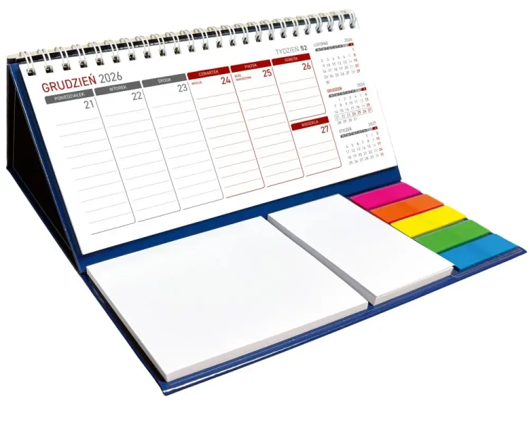 Wygodny kalendarz stojący na biurko z przejrzystym kalendarium w układzie tygodniowym z poręcznymi karteczkami samoprzylepnymi do notowania. Przydatny zwłaszcza w biurze.