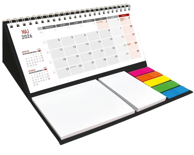 Praktyczny kalendarz stojący na biurko z przejrzystym kalendarium w układzie trzymiesięcznym. Poręczne samoprzylepne karteczki do notowania. Kalendarium na spirali.